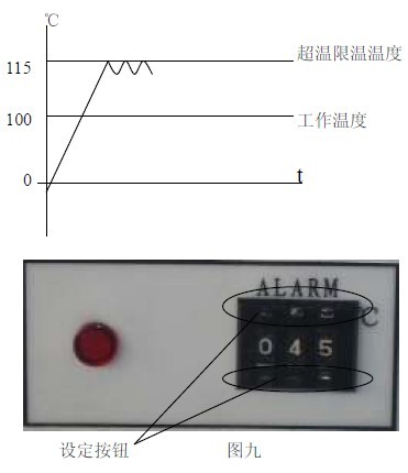 11.2 見(jiàn)圖九,用面板上超溫設(shè)定撥盤的+、— 按鈕進(jìn)行設(shè)定所需限溫溫度。
